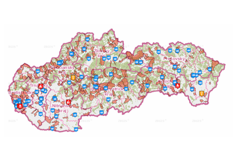 Mapa prostredníctvom ikon zobrazuje aj sídla a podrobnejšie informácie o prevádzkach. Detail s konkrétnymi informáciami je možné získať po kliknutí na ikony. Ikony sú viazané na konkrétne adresy. Pri zapnutí viacerých vrstiev sa môžu ikony prekrývať.